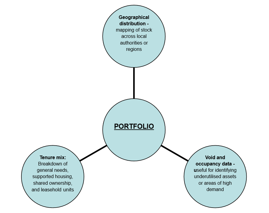 - Covenant compliance data: Metrics used by the lenders to assess financial health and risk and importantly for housing associations, to monitor covenant thresholds to avoid breaches.